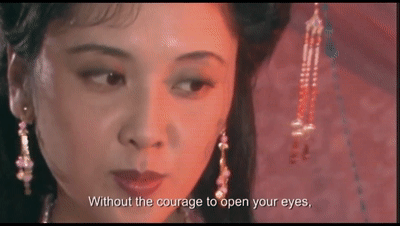 女儿国国王向唐僧示爱时,问道:“不敢睁眼看我,还说什么四大皆空呢?”(Without the courage to open your eyes, have you achieved emptiness?)